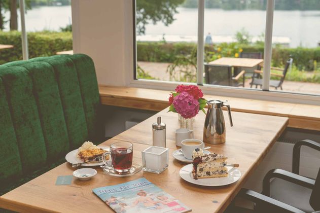 Hjemmelavede kagespecialiteter og solide snacks tilbydes i den venlige, åbne atmosfære. Og alt dette med legehjørne, terrasse og legeplads med direkte udsigt over søen, da caféen ligger i det stilfuldt renoverede LAKE HOUSE-hotel direkte ved Edeberg-søen i Fegetasche i Plön. Fegetasche er et ideelt udgangspunkt for udflugter til Plön med sine mange gratis parkeringspladser, anløbsbroerne til 5-Seen-Cruise og Plön-Seen-Cruise, strandstien og den rummelige familiestrand.