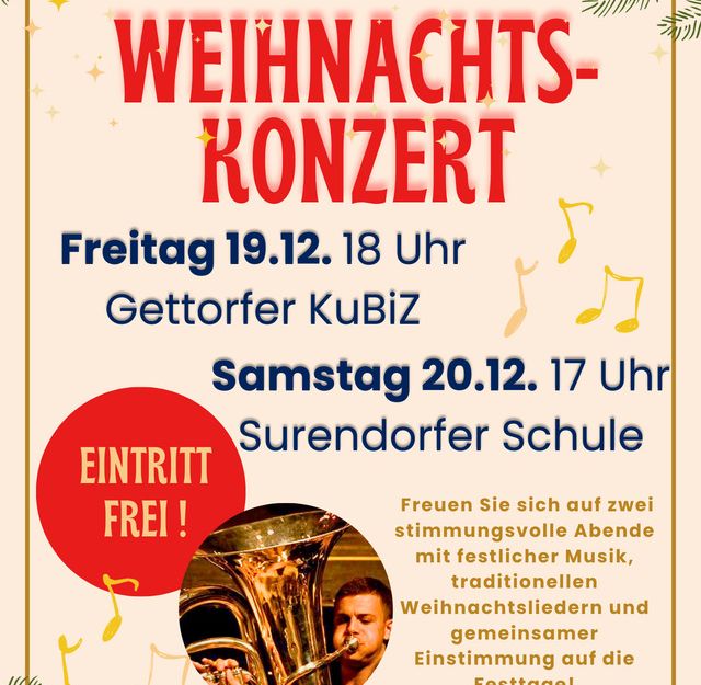 Jahresabschlusskonzert des rund 40-köpfigen Blasorchesters mit beiden Dirigenten! Das Orchester präsentiert ein breit gefächertes Repertoire - von klassischen Weihnachtsliedern über Gospel bis hin zu modernen Arrangements. Das WohldOrchester ist hervorgegangen aus dem Zusammenschluss von zwei traditionsreichen Blasorchestern der Region: dem Jugendrotkreuzorchester Eckernförde und dem Ostseeorchester Schwedeneck. Der Eintritt ist frei, für das leibliche Wohl ist gesorgt.