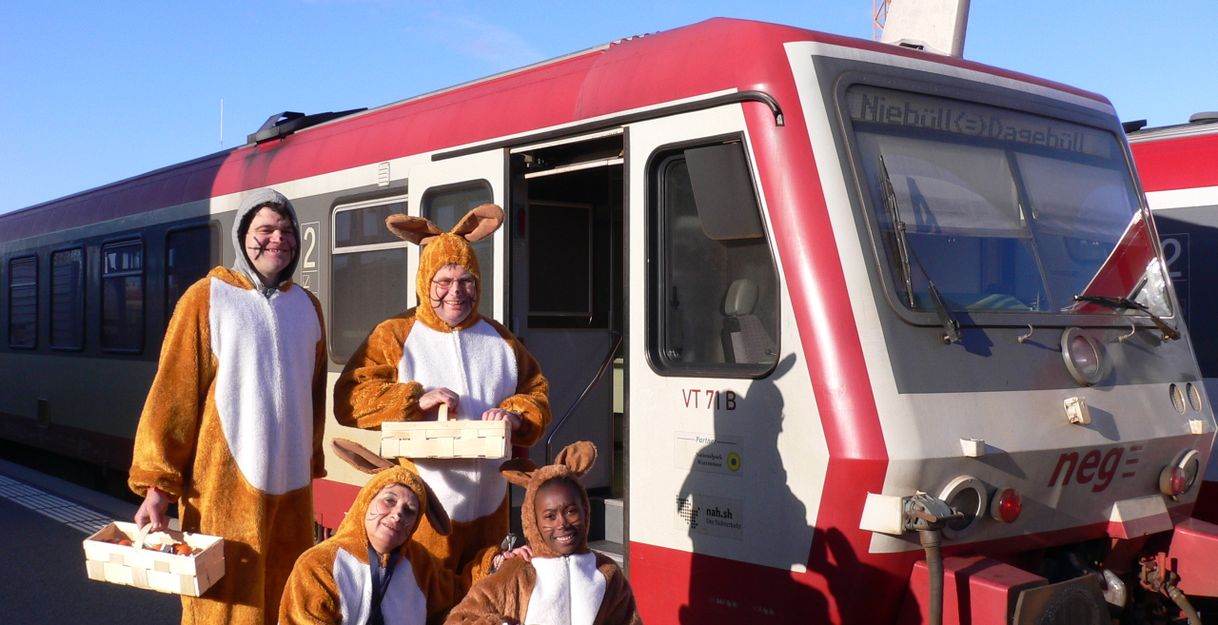 Am Ostersamstag um 10:00 Uhr wird es in Dagebüll fröhlich und bunt! Alle großen und kleinen Besucherinnen und Besucher können sich auf ein hasenstarkes Treiben freuen. Einige Osterhasen kommen mit dem Zug und verteilen fleißig hartgekochte Eier entlang der Flaniermeile.
