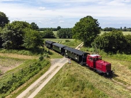 Der Museumsbahnhof Schönberger Strand erstrahlt durch stimmungsvolles Licht.